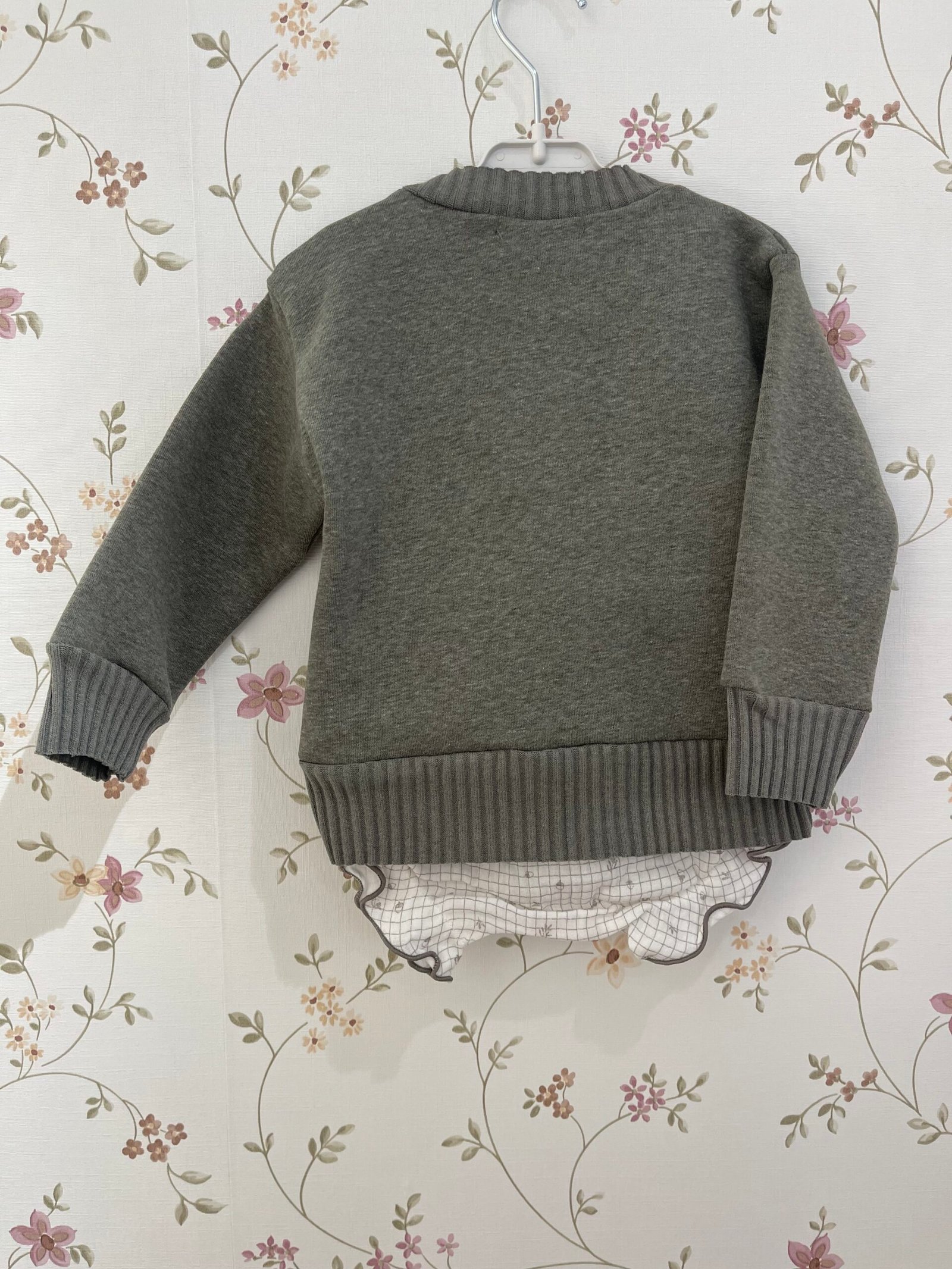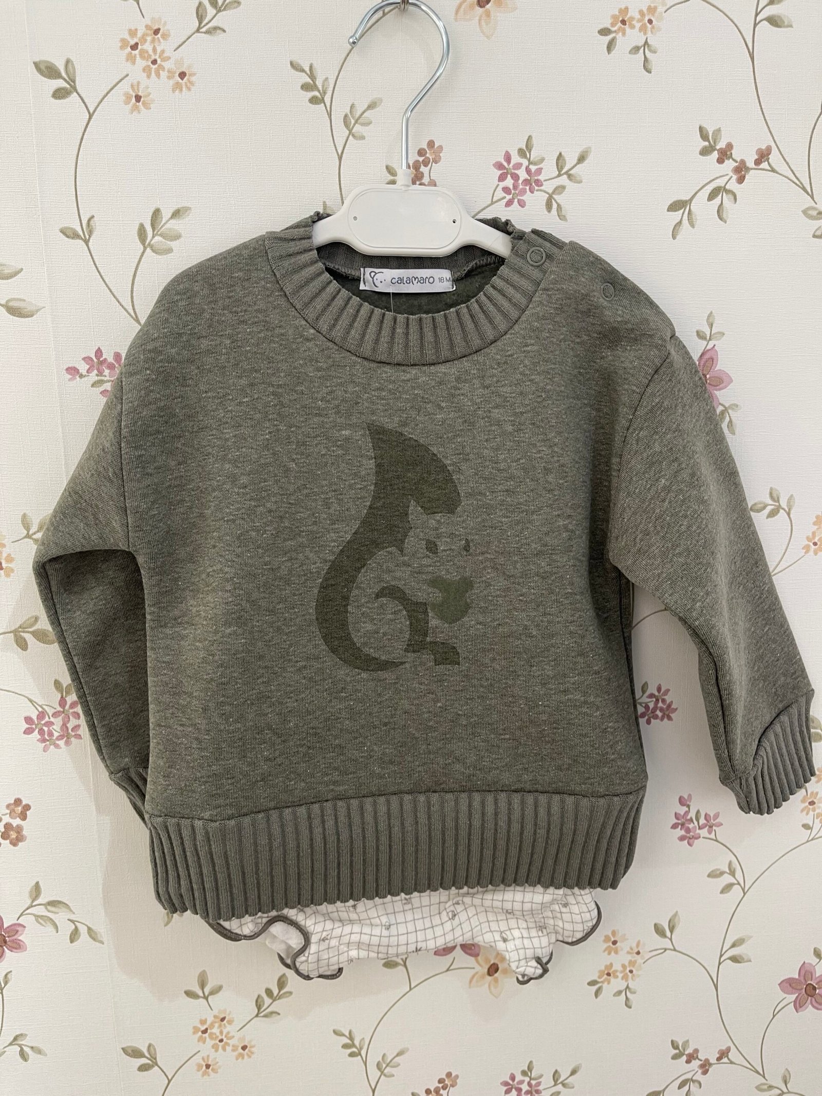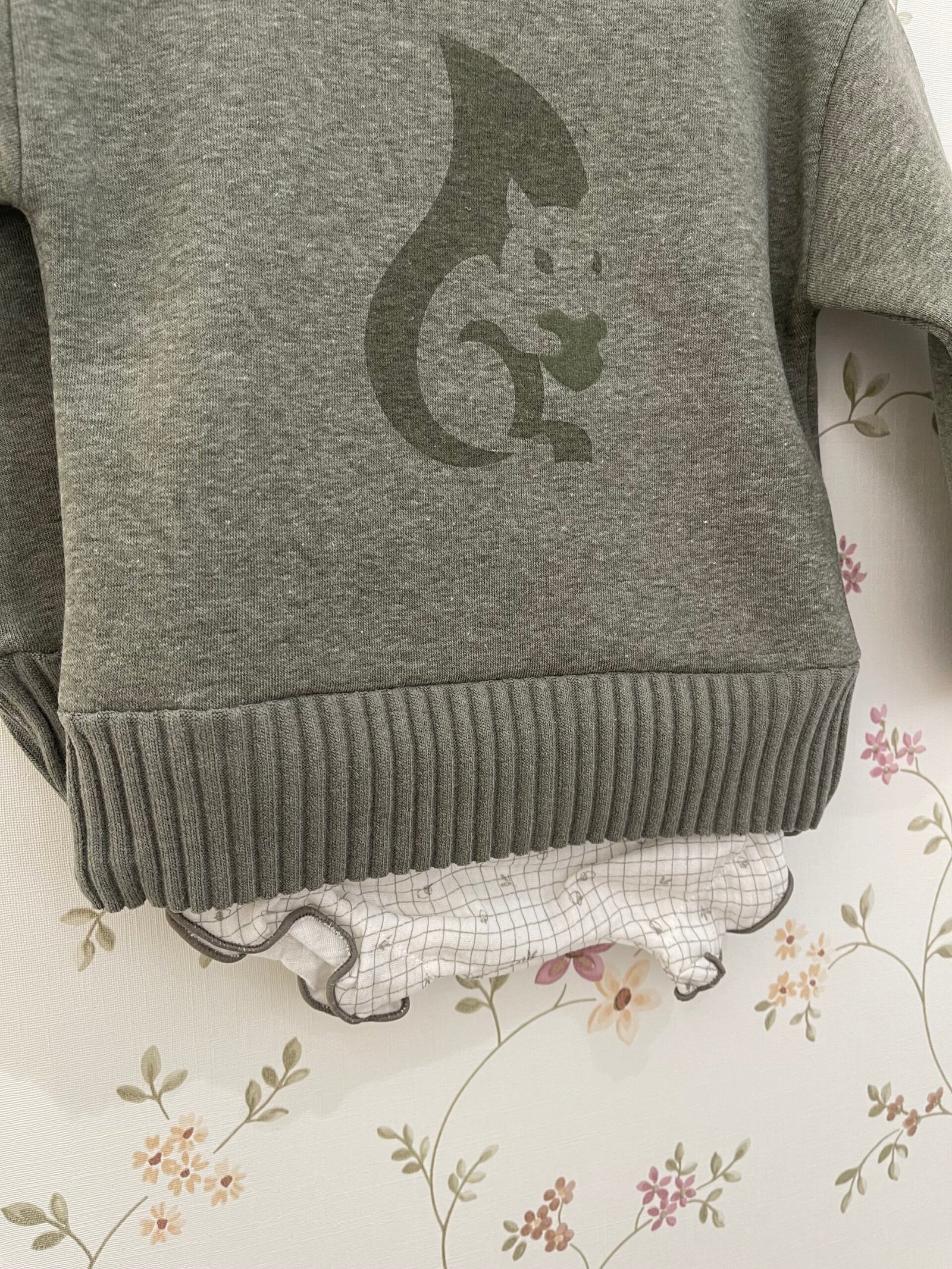 Conjunto de pololo modelo Kalmar con 2 piezas para bebé. Compuesto por jersey de color verde oscuro con dibujo de ardilla; y pololo blanco a cuadros.